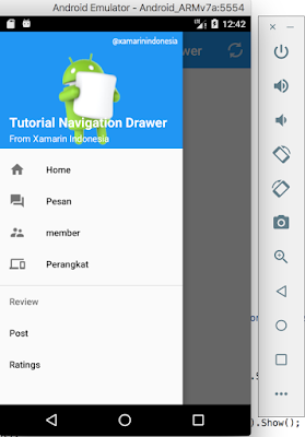 Selamat pagi semua, setelah menikmati akhir pekan saya mulai melakukan eksperiment kembali, pada kesempatan kali ini adalah membuat Navigation Drawer pada Xamarin Android. Secara fungsi mirip dengan tutorial saya sebelumnya yaitu Membuat Left Drawer Menu Xamarin Android. Navigation Drawer ini memiliki desain UI yang lebih keren, oleh karena itu untuk beberapa project alangkah baiknya menggunakan Navigation Drawer ya. Demo aplikasi yang akan saya buat kurang lebih seperti berikut ini .